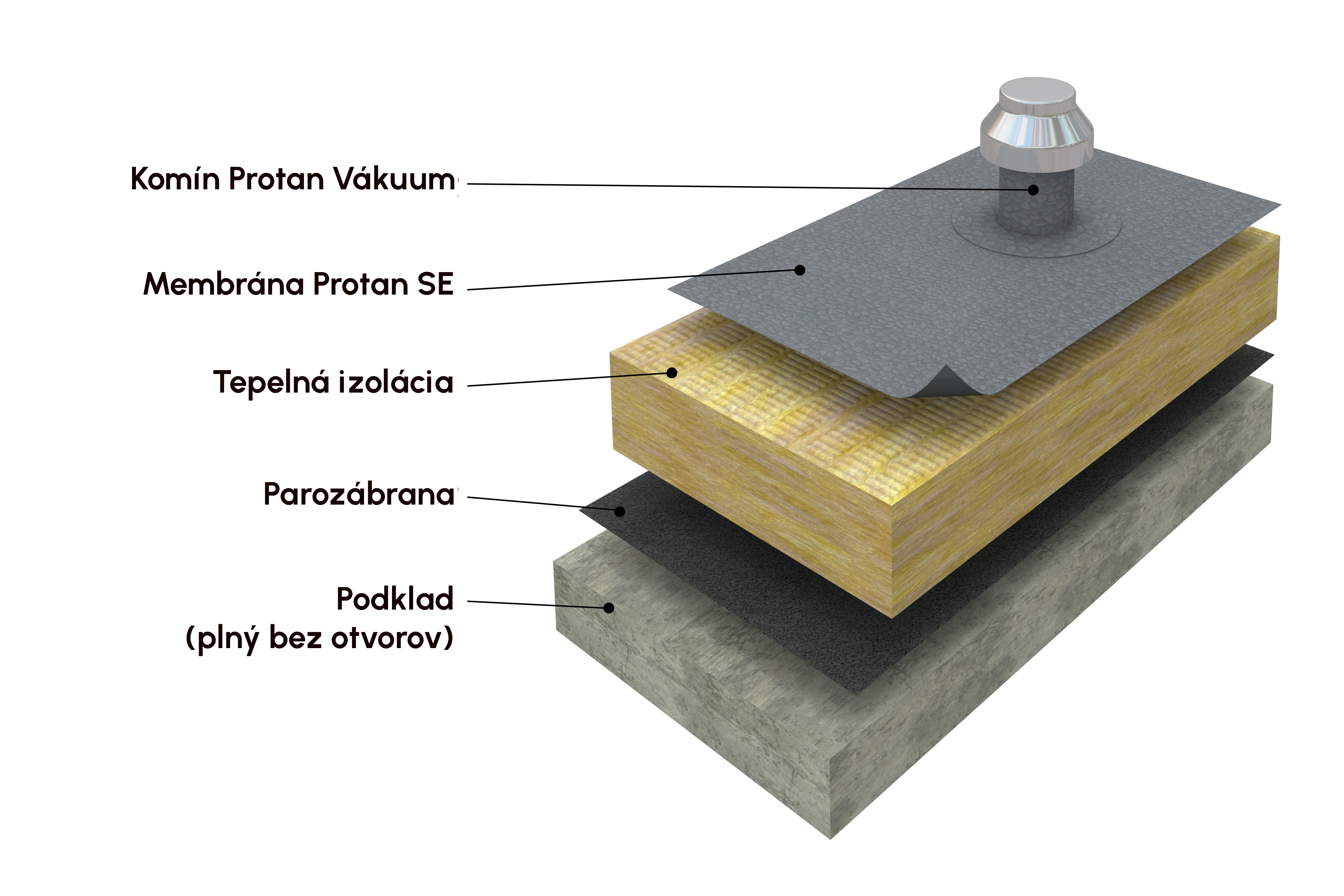 V závislosti od podkladu sa ako strešná krytina vo vákuovom strešnom systéme používajú membrány Protan SE alebo Protan EX. Vákuové krby sú inštalované na streche, aby rozptyľovali nadmerný tlak, ktorý vzniká medzi krytinou a utesnenou základňou. Vákuové krby sa umiestňujú tam, kde je podtlak najväčší, zvyčajne v rohoch a okrajoch.